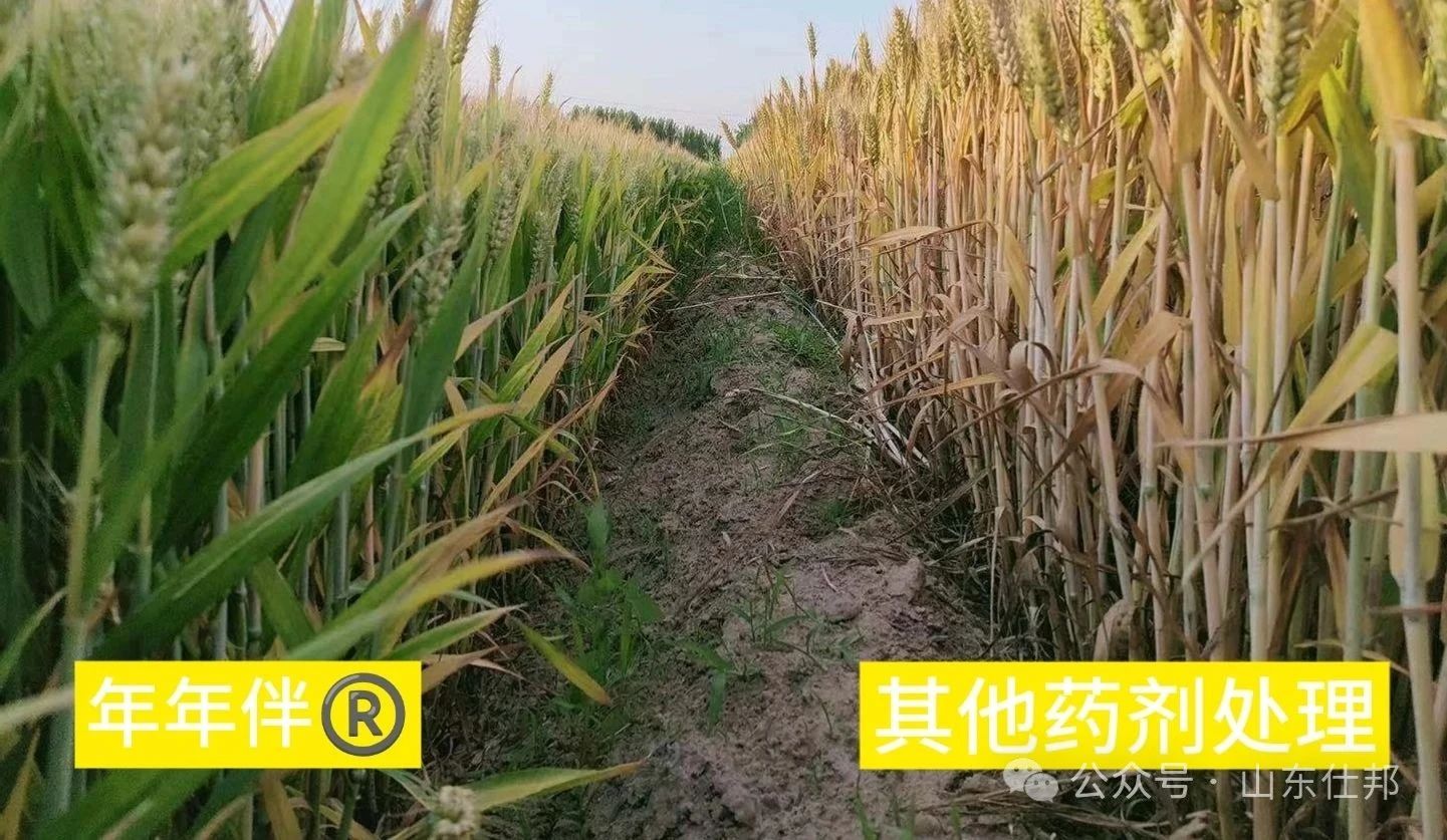 經(jīng)過大量的試驗,計算得出使用年年伴®拌種后對莖基腐病綜合防治效果達到75%以上。小麥相同地塊使用過年年伴®和使用其他拌種劑的差距非常顯著,使用過年年伴®的莖稈青綠,無病斑,沒有早衰和白穗現(xiàn)象。麥穗大,籽粒飽滿,品質(zhì)高。