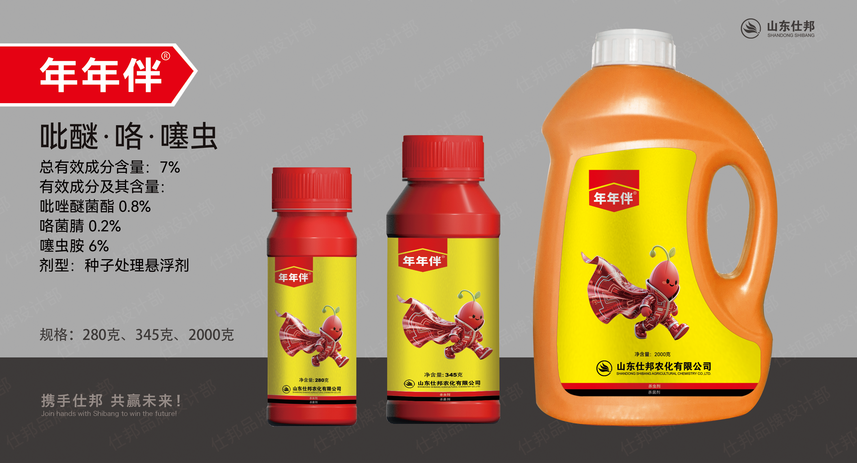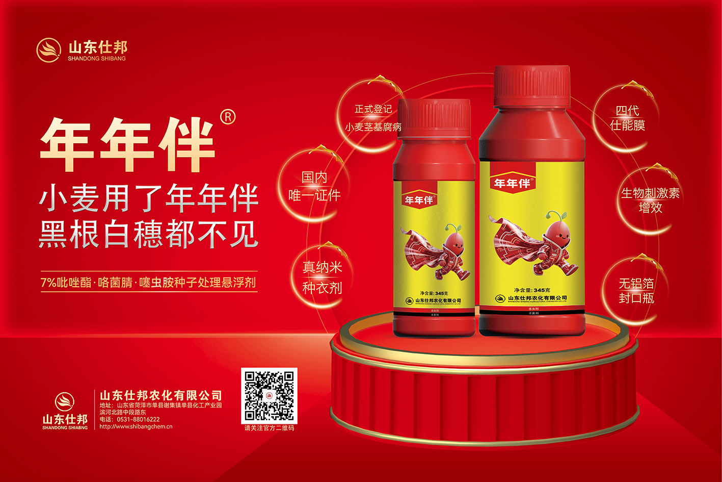 年年伴®是山東仕邦農(nóng)化有限公司種衣劑的二十年技術(shù)積累的集大成者。歷經(jīng)一年時間,對市面上的20種主流殺菌劑進行篩選,做了幾百個單劑以及混配配方對小麥莖基腐病致病菌毒力的室內(nèi)試驗,篩選出配方后,前后歷經(jīng)六年各省市近千塊示范田的效果驗證,六年磨一劍,如今正式推出了7%吡咯噻年年伴®產(chǎn)品。
